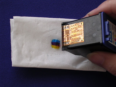 要偵測墨水匣是否乾掉很簡單,用衛生紙輕輕接觸噴嘴即可,如果正常有墨水,就會被吸到衛生紙上,如上圖。